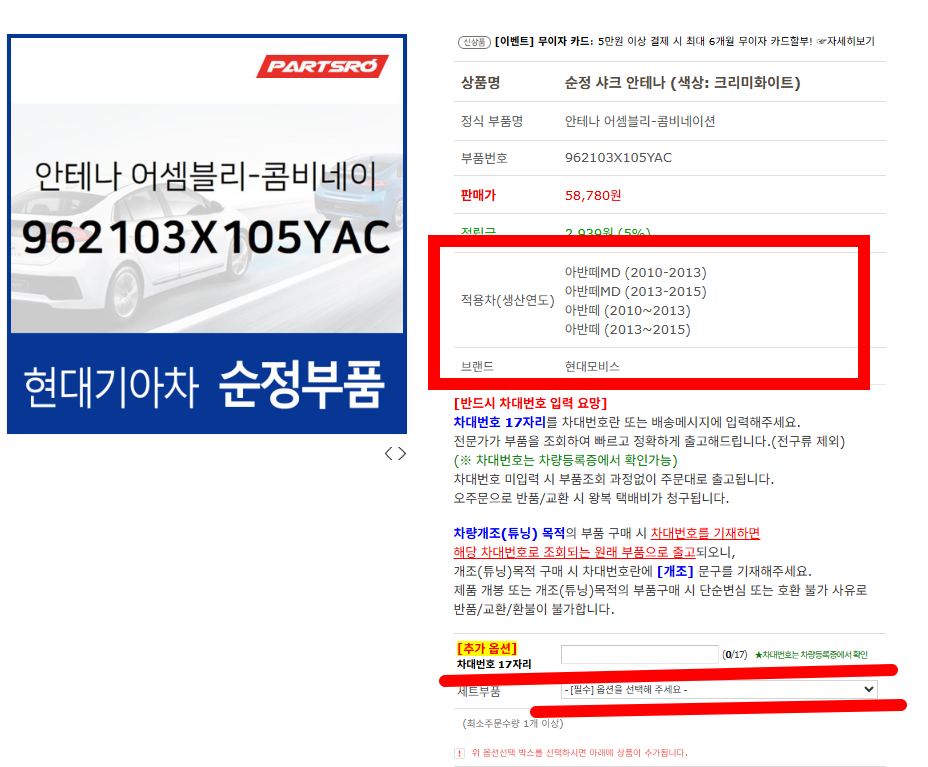 제 차량은 아반떼 MD 였고 추가옵션에서 차대번호 17자리를 넣어서 차량과 부품이 적합한지를 재 확인 했습니다.